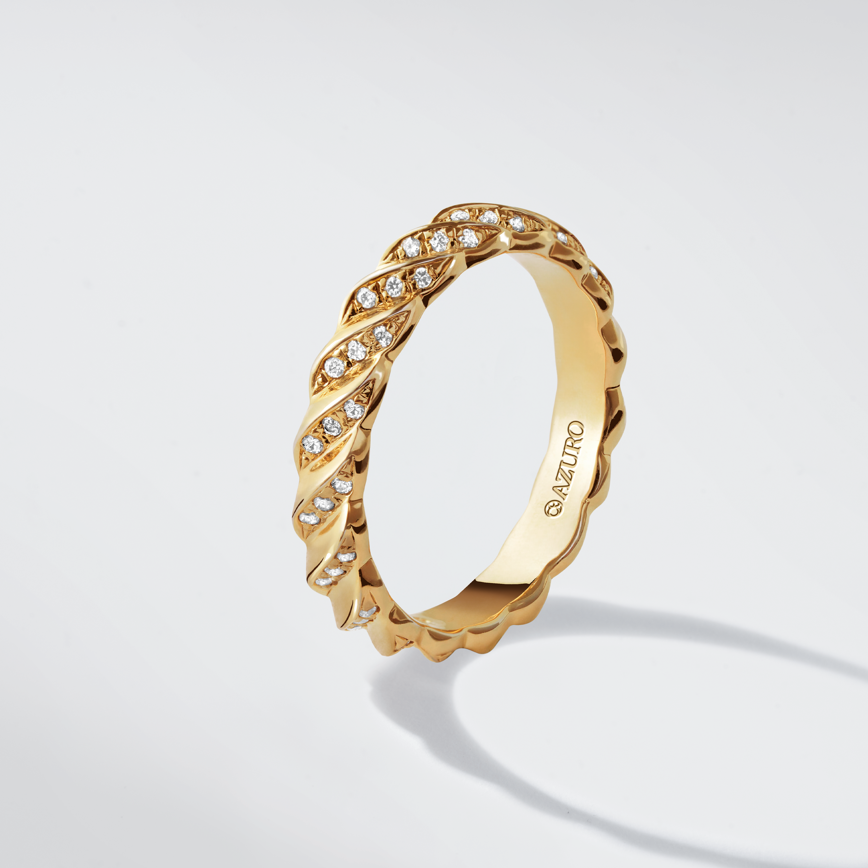 這款月桂葉設計呈現更加緊密的排列,讓整體立體感更加出眾。流暢的葉脈設計賦予戒指優雅的曲線美。獨特之處在於每片葉子的另一半都嵌入了三顆小鑽,為設計增添了奢華的華麗感。精湛的工藝水準使得這款戒指成為匠心獨具的藝術品。
