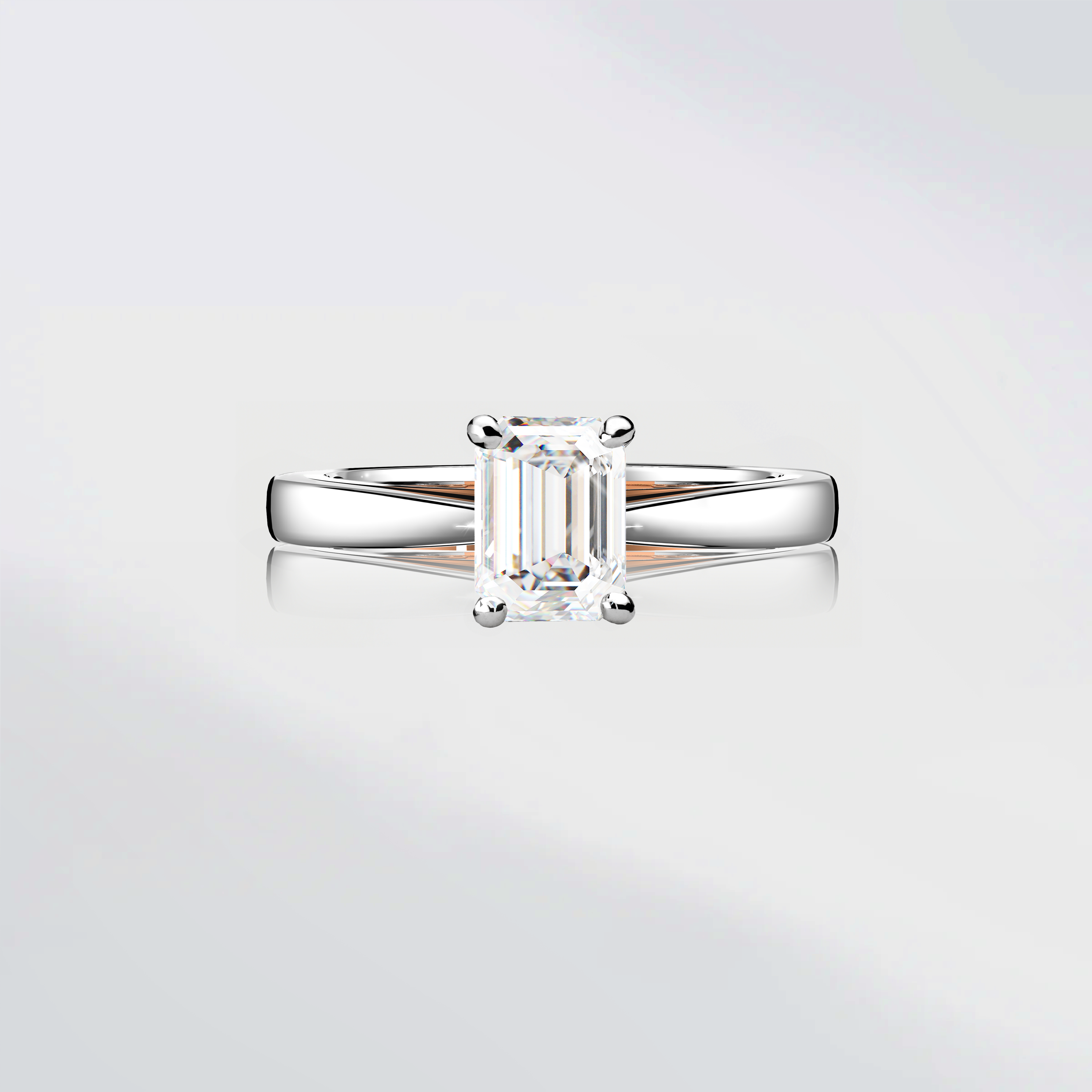 AZF005-E 求婚鑽戒的設計理念是將玫瑰木的溫暖和庇護感融入鑽戒,以1.0克拉的祖母綠車工鑽石點綴,展現出自然、溫馨且舒適的氛圍,象徵著愛情的溫暖和安定。