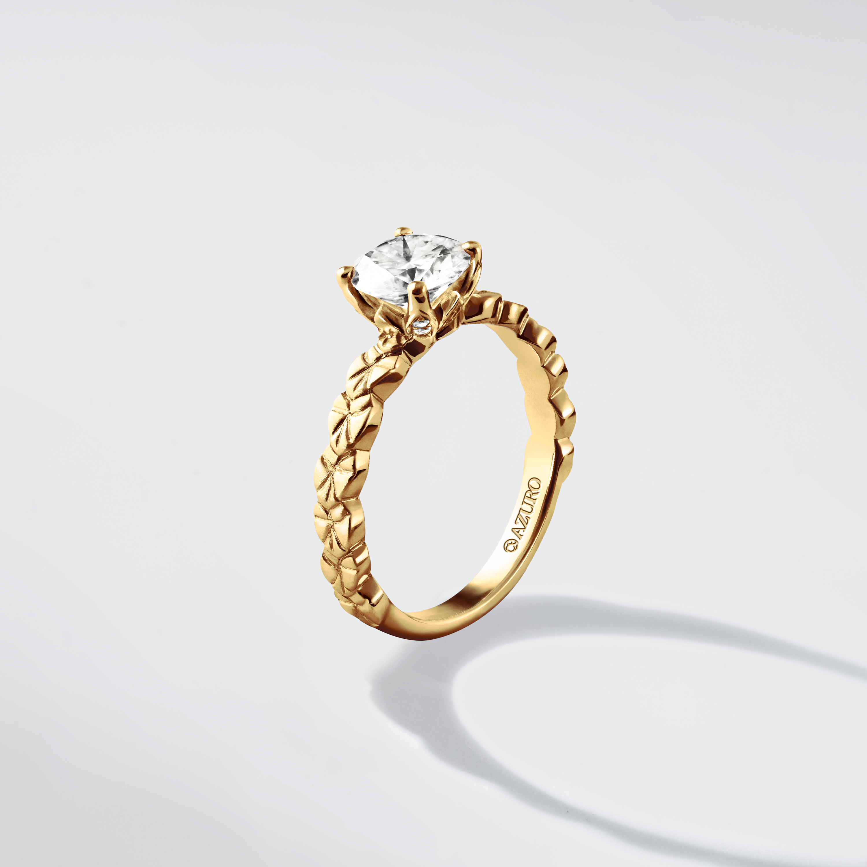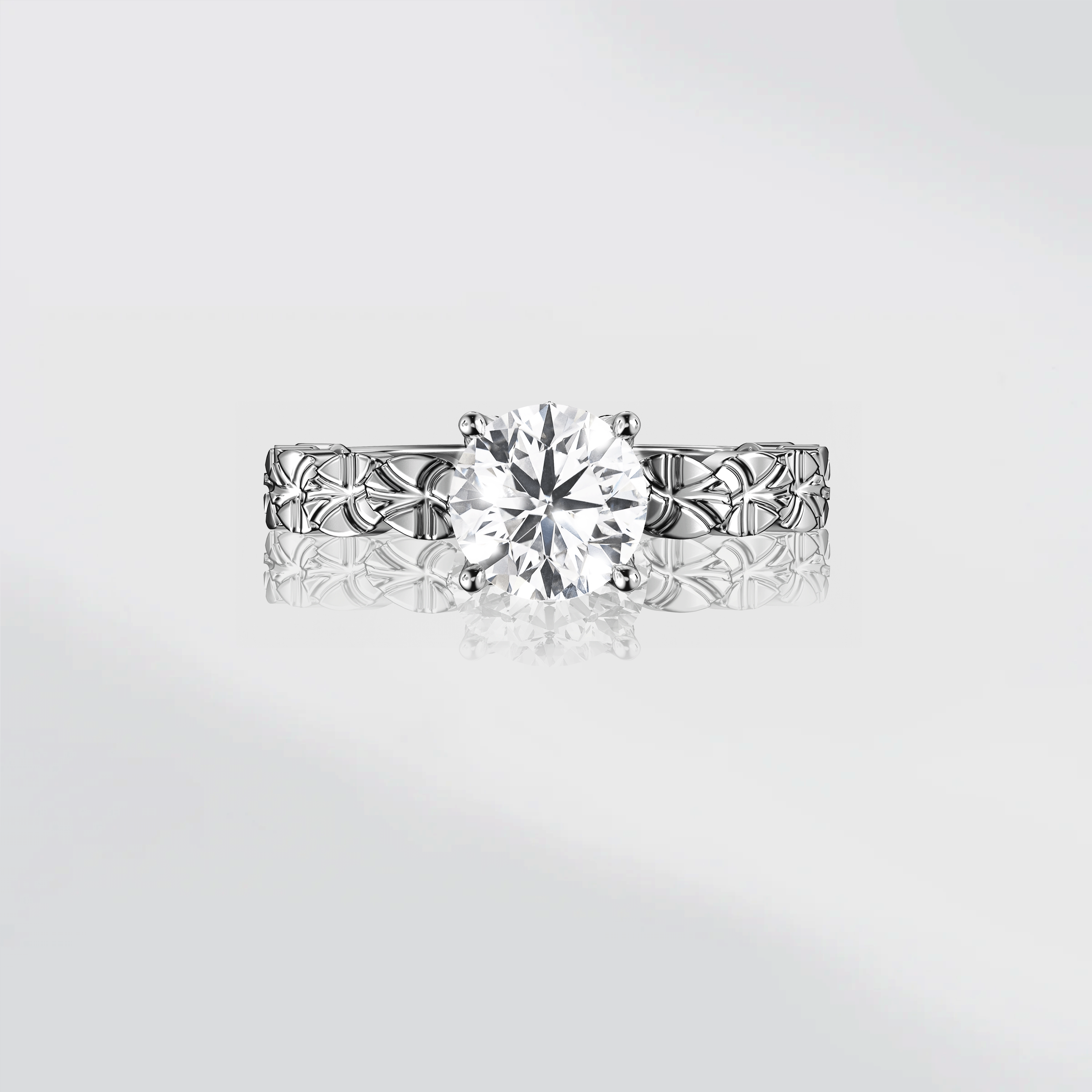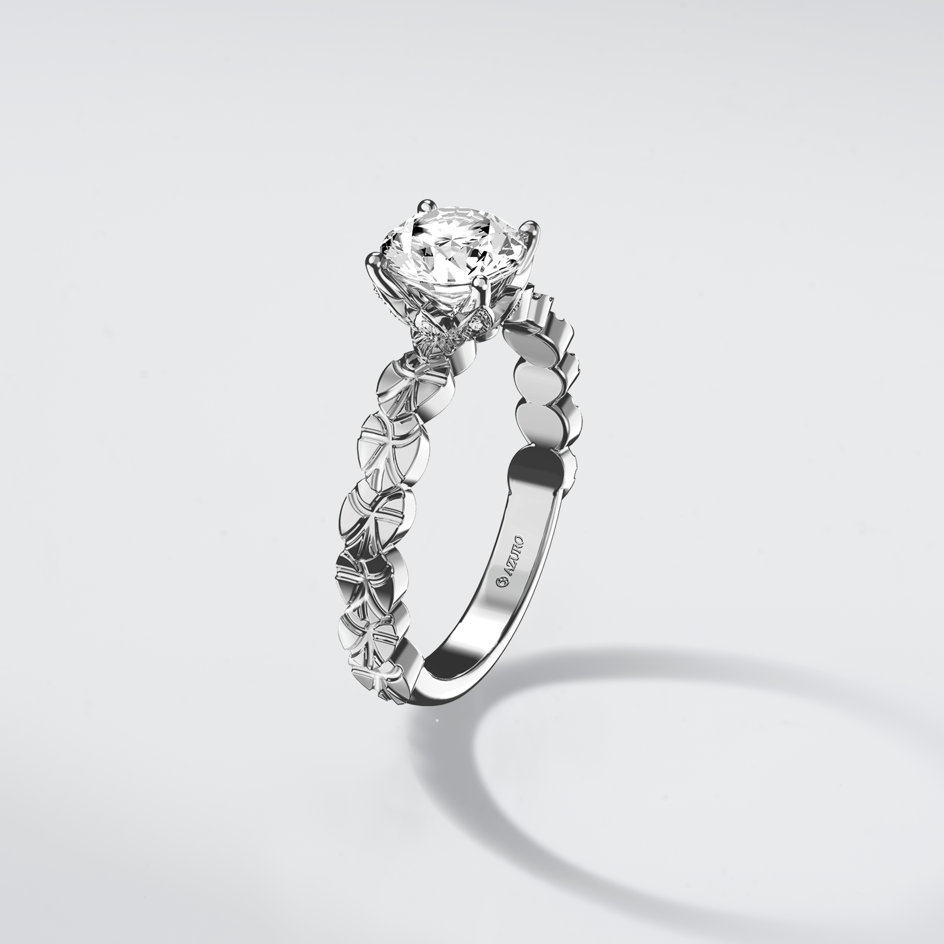 每片蓮葉以手工噴砂呈現獨特質感,戒托採用蓮花花瓣設計,側面鑲嵌小鑽增添高級感。四爪戒托與側邊鑲鑽,凸顯主鑽美感。象徵純潔與生機,展現優雅和和諧之美。柔軟葉片與華麗花瓣交織,自然之美盡現。